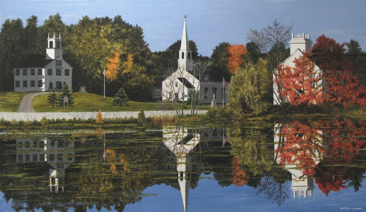 Shortly after finishing the acrylic paintings on wood, I was asked to paint a mural of Marlow village on the wall of the multipurpose room at the John D. Perkins, Sr. Elementary School in Marlow, New Hampshire. I had never attempted anything on this large of a scale, but took on the challenge. After two months in the summer of 2008 painting at night and on many weekends, I finished the mural on the day before school started! I still cannot believe I actually did the painting when I look at it now. You can see the mural in process here...