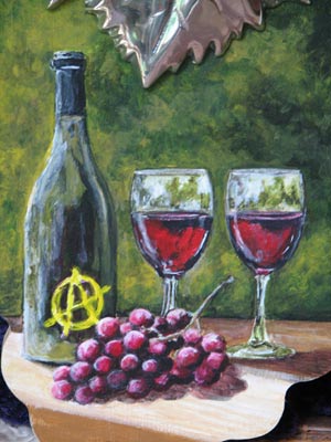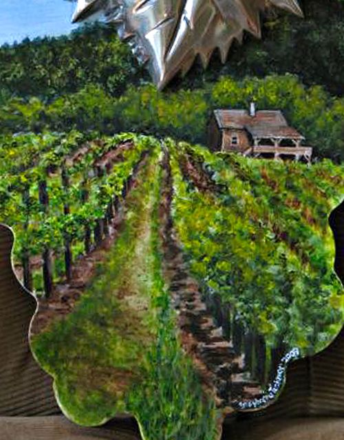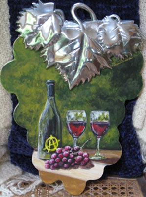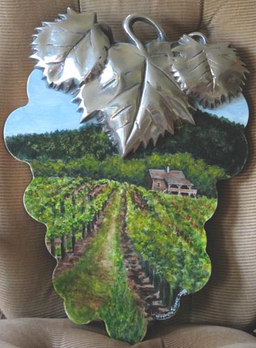 These two paintings of the wine bottle and the vineyard were done at the request of a friend who had the two pieces of wood in the shape of a bunch of grapes. I had never painted in acrylics before, so I went out and bought some new paints, practiced on some scrap pieces of wood, took photos of the arrangement, then got to work. Acrylics are very different from watercolors, but it was a fun adventure!