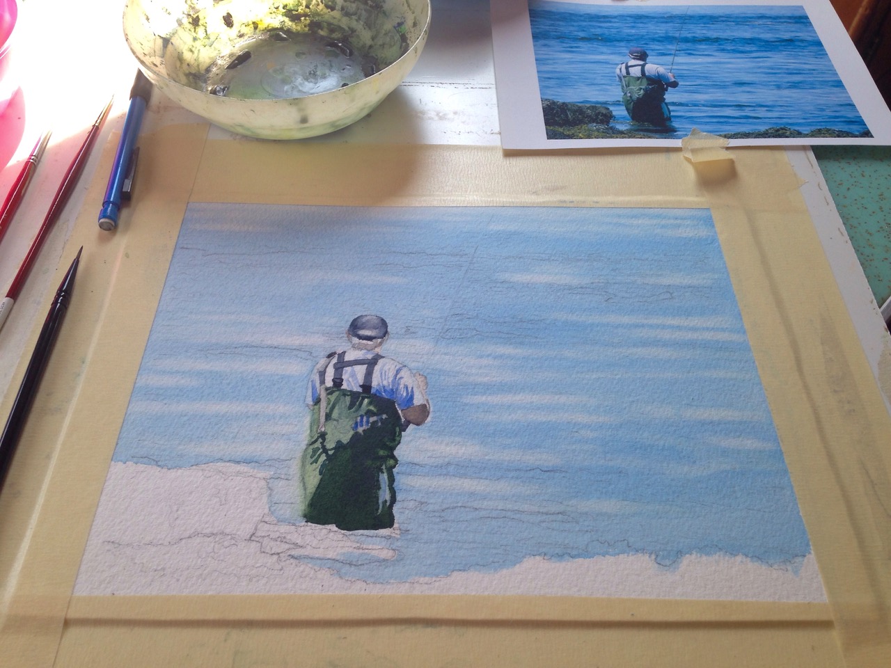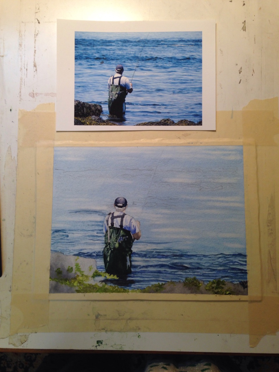 I took the photo I used for this painting while camping at Salisbury Beach State Reservation in Massachusetts, then I worked on the painting camping there the following year. I did a wet wash for the water, then used a paper towel to pull out some of the color for the waves. Once the background was dry I started adding details to the fisherman.
