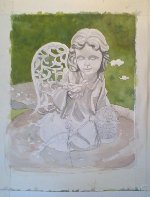 After sketching the angel lightly in pencil on 300 lb. cold press watercolor paper, I started doing light washes.