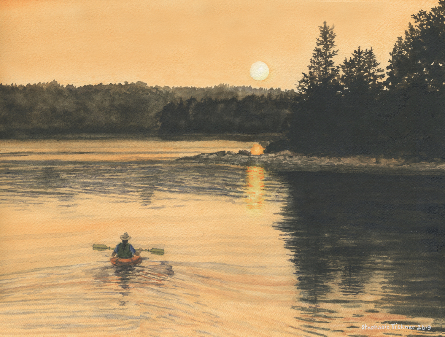 In August of 2009 my family and I headed north for two weeks starting on the New Hampshire coast, then traveling up into Maine and Acadia. We found a beautiful campground along the Schoodic Scenic Byway called Flanders Bay Campground. This campground is surrounded on three sides by the stunning Flanders Bay. The weather was perfect, and the mornings were so still, allowing views of lobster boats, islands and distant mountains. This painting was inspired by a photo I took of my husband in our kayak during this incredible sunset. The colors were amazing! We loved this campground and the Schoodic Peninsula so much, we returned again in August 2011. I highly recommend a visit!